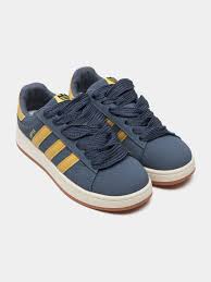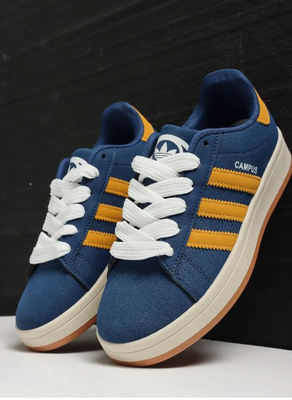 кроссовки Adidas Campus из синей замши с белыми шнурками и горчично-коричневыми полосками.
