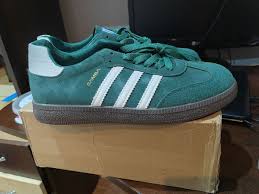 кроссовки Adidas Samba OG в зеленом цвете с белыми полосками и резиновой подошвой.