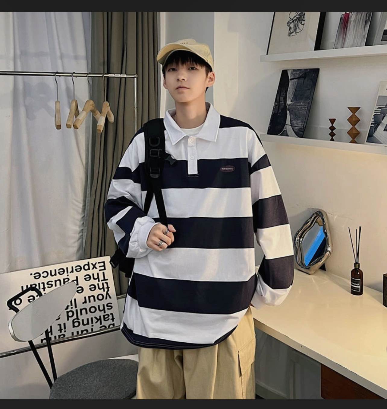 мужская футболка-поло с длинными рукавами в коричневую и белую полоску с воротником на молнии.