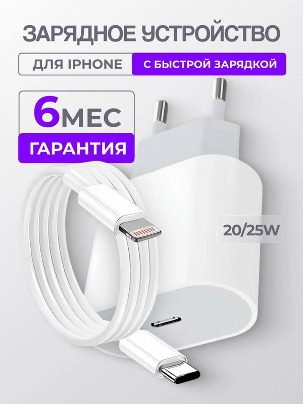 Блок питания для iPhone, 20/25w, с быстрой зарядкой, с кабелем Type-C - Lightning, зарядка