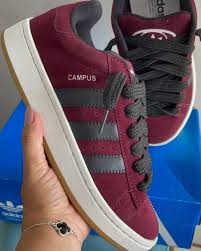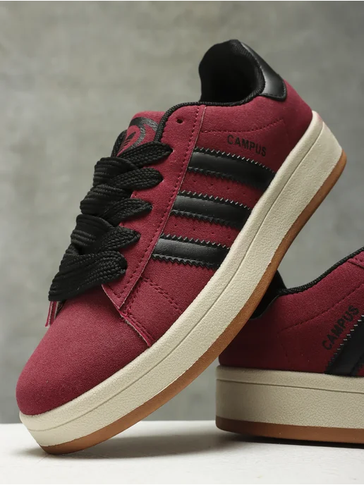 бордовые кроссовки Adidas Campus с черными полосками и черными шнурками.