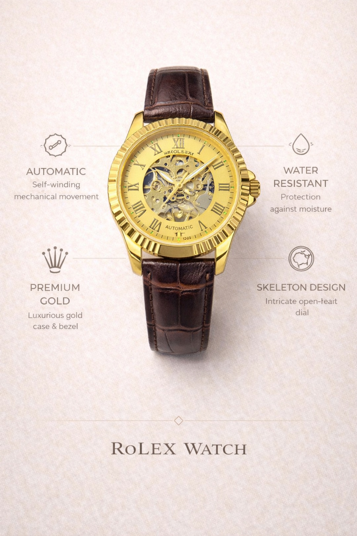 Роскошный золотой корпус и безель подчёркивают статус и придают часам элегантный внешний вид.