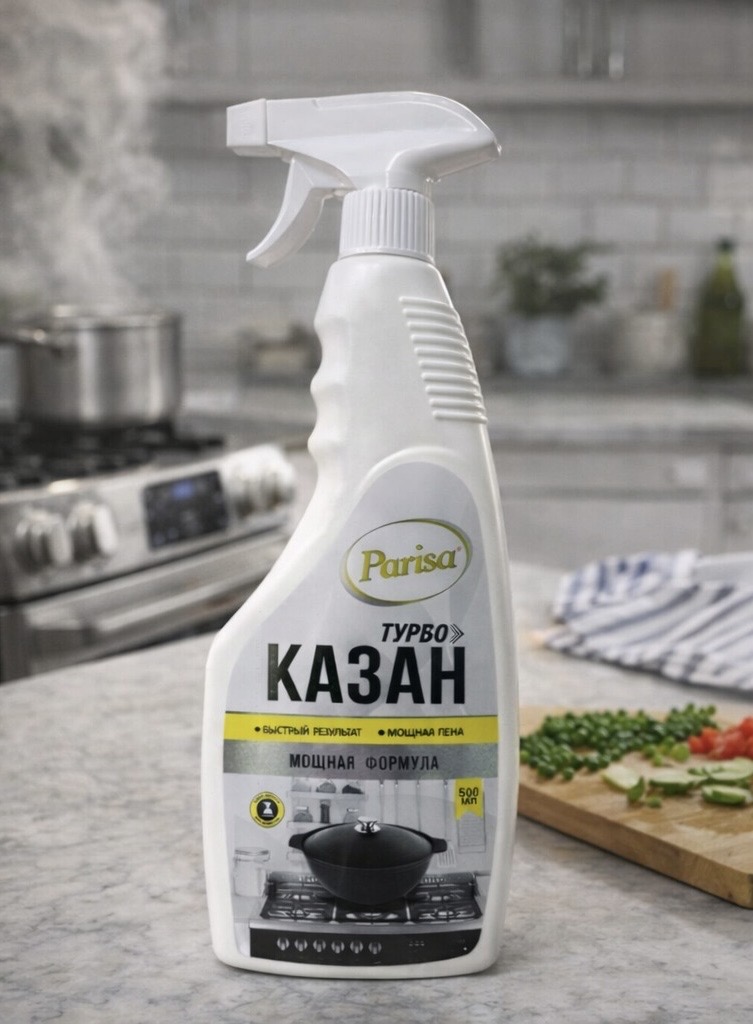 Мощное средство для быстрого и эффективного удаления жира, нагара и пригоревших загрязнений на кухне. Идеально подходит для ухода за плитами, казанами, сковородами и духовками