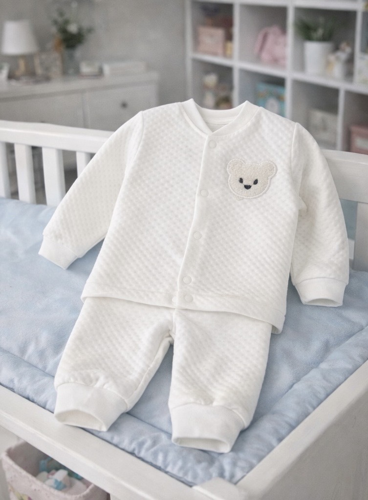 Нежный и уютный комплект для малышей, идеально подходящий для первых месяцев жизни. Выполнен в спокойном молочном цвете с милой вышивкой мишки — отлично подойдёт как для дома, так и для сна