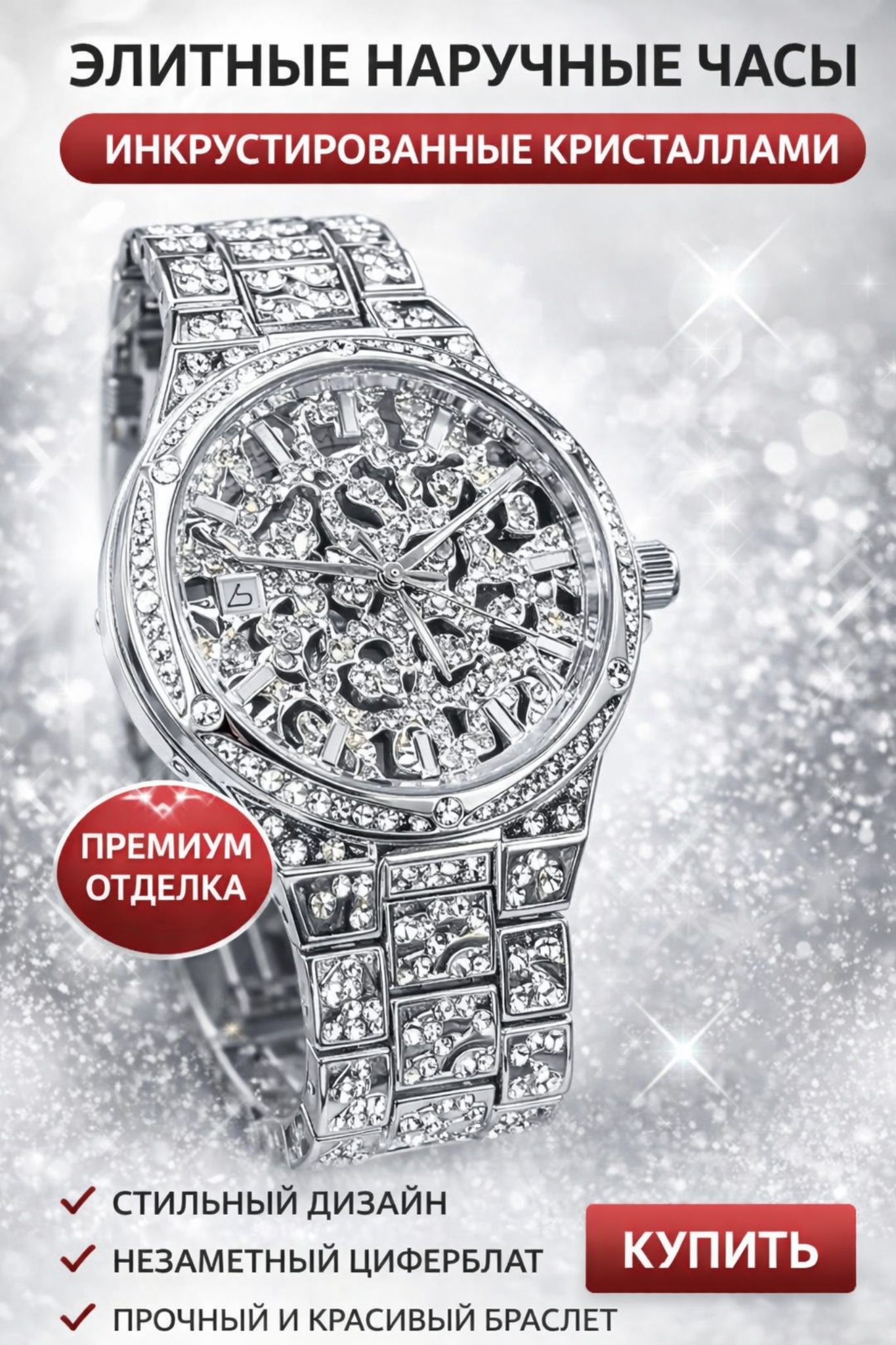 Корпус и браслет украшены сияющими кристаллами, создающими эффект роскоши и блеска.