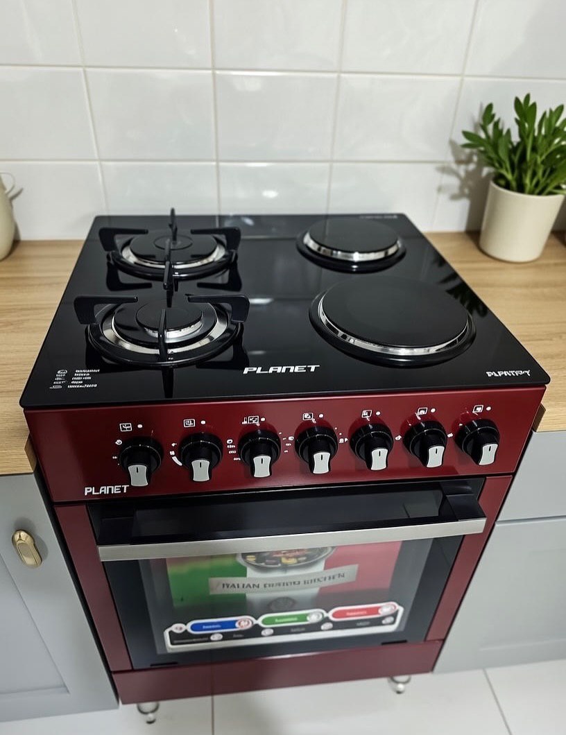ТЕХНОСИТИ приглашает добавить тепла и стиля на кухню: бордовая газовая плита Planet с электрической духовкой – воплощение итальянского шарма для повседневных шедевров! 4 мощные конфорки для быстрой варки + просторная духовка на 60 л – готовьте пасту, запеканки или гриль с лёгкостью и любовью.