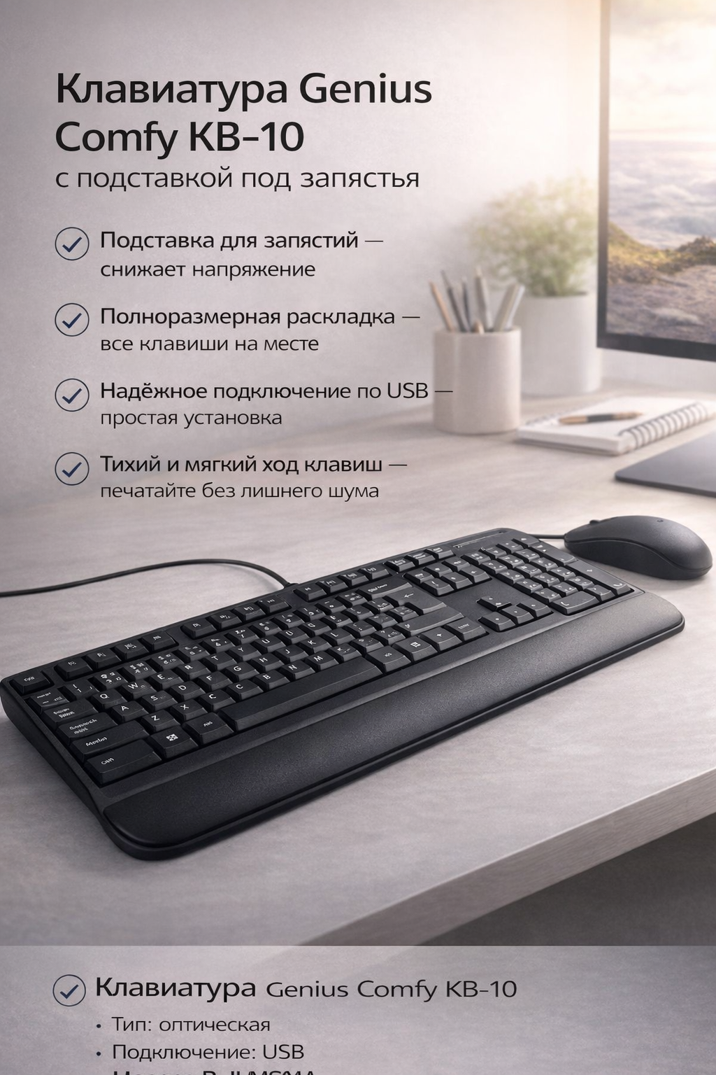 ✔ Подставка под запястья — снижает нагрузку и напряжение рук