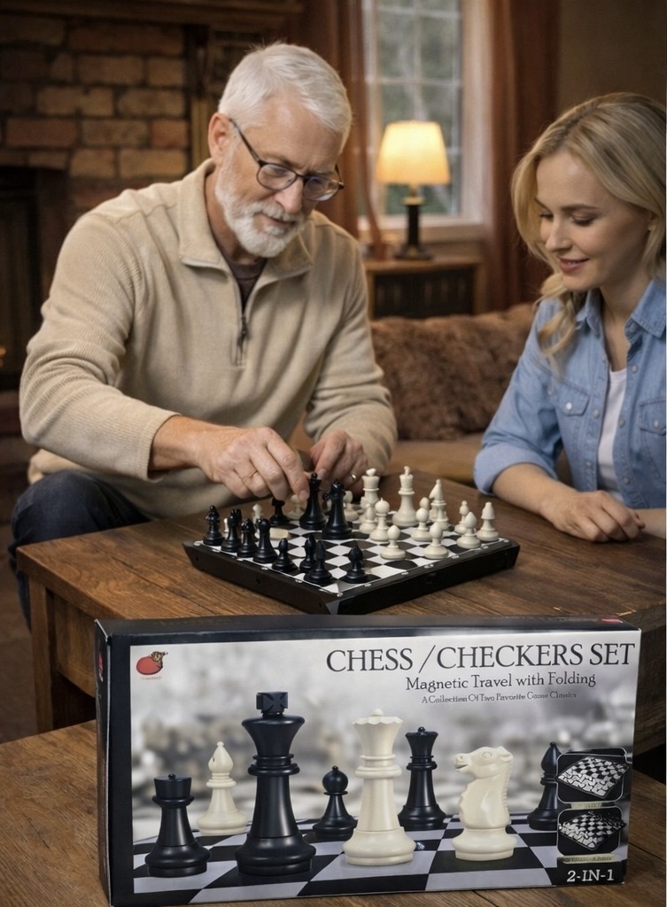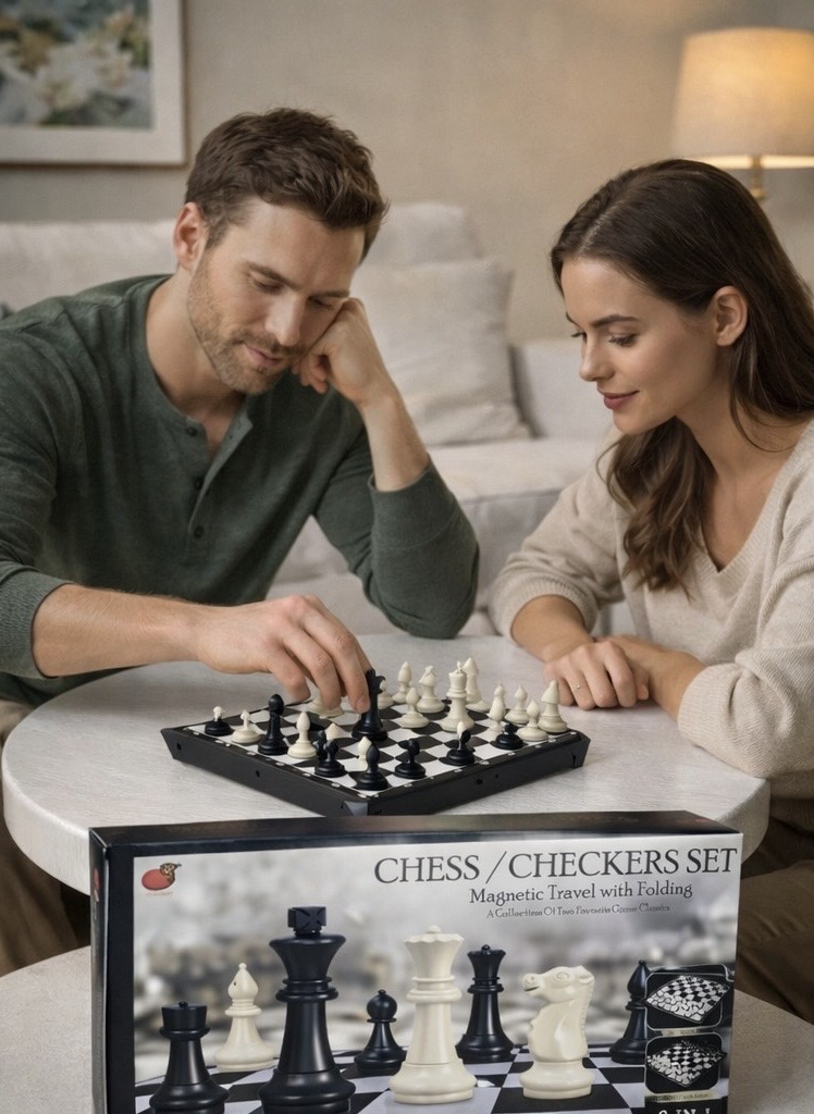 Стильный и практичный набор шахмат и шашек, идеально подходящий для дома, путешествий и подарка. Компактный формат и магнитные фигуры делают игру удобной в любых условиях