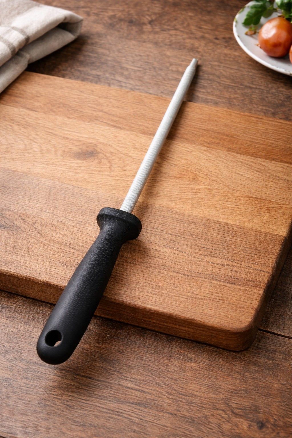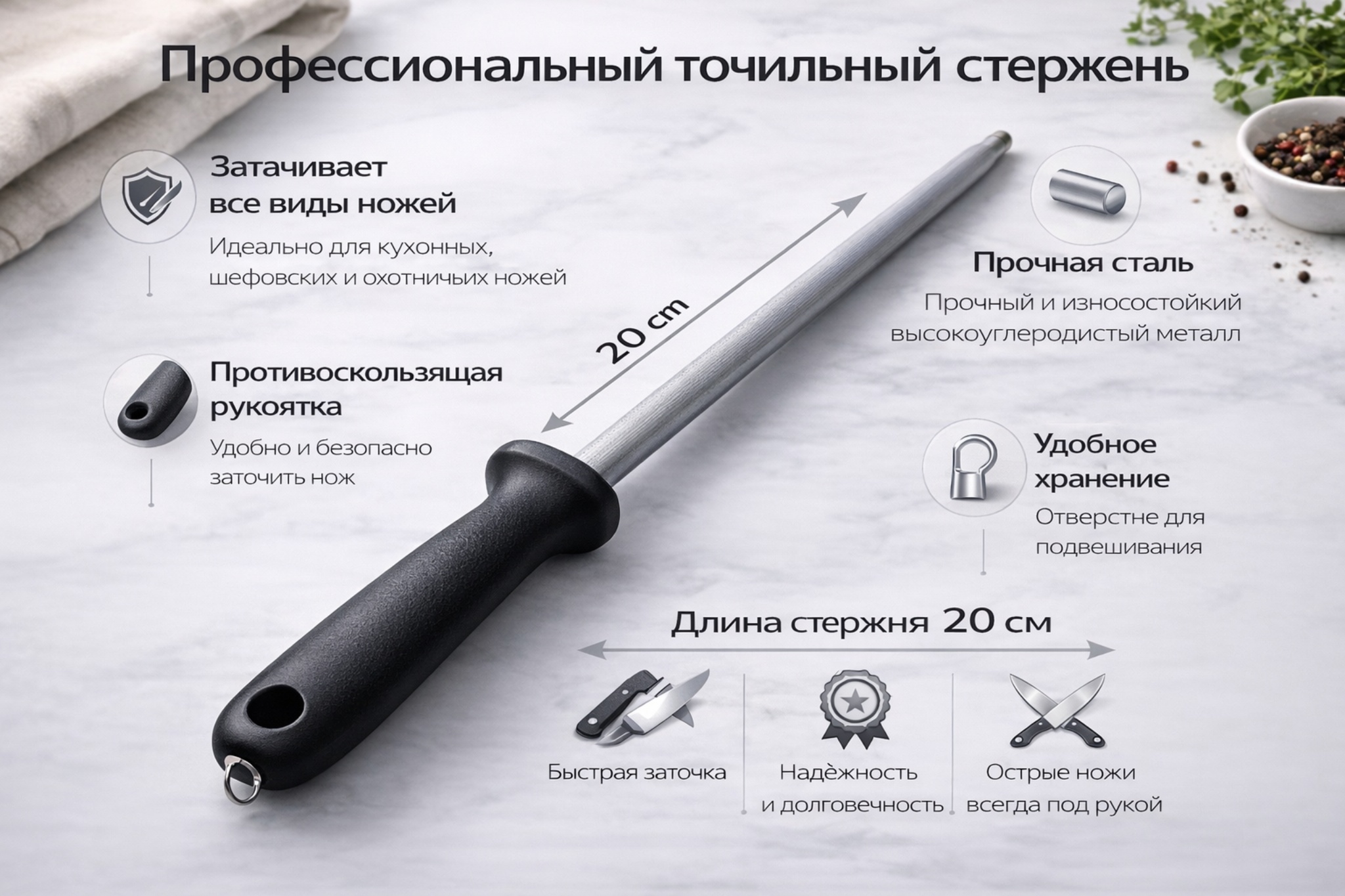 Рабочая часть выполнена из прочной стали с равномерной насечкой, обеспечивающей точную и безопасную правку лезвия. Эргономичная пластиковая ручка удобно лежит в руке, не скользит и оснащена отверстием для подвешивания, что удобно для хранения на кухне.