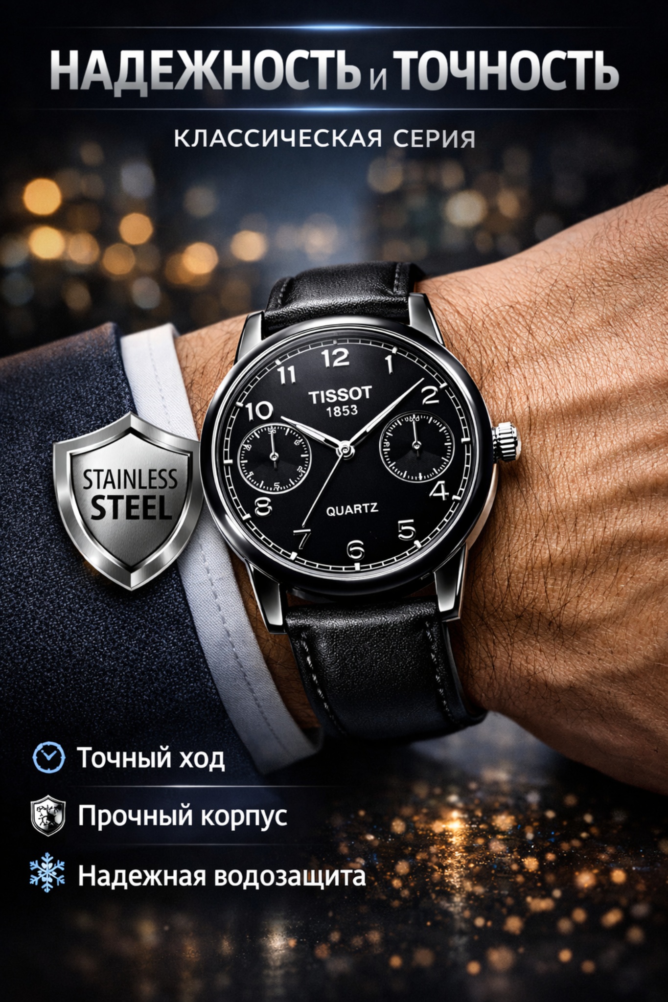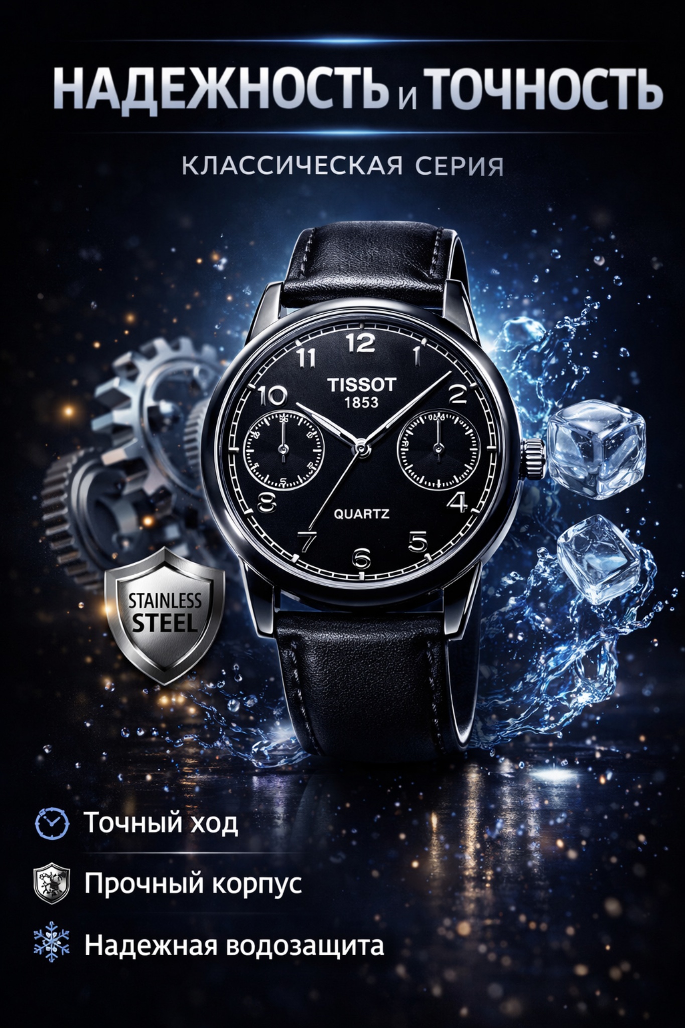 Стильные мужские часы в минималистичном дизайне с чёрным циферблатом и кожаным ремешком. Универсальный аксессуар для делового и повседневного образа. Подчёркивают аккуратность и статус владельца.