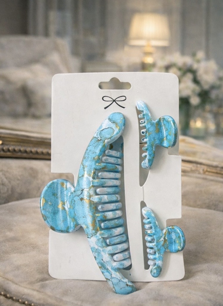 Стильный набор заколок в мраморном голубом оттенке с золотистыми прожилками — элегантный аксессуар для создания аккуратных и модных причёсок. Идеально подойдёт как для повседневного использования, так и для особых случаев