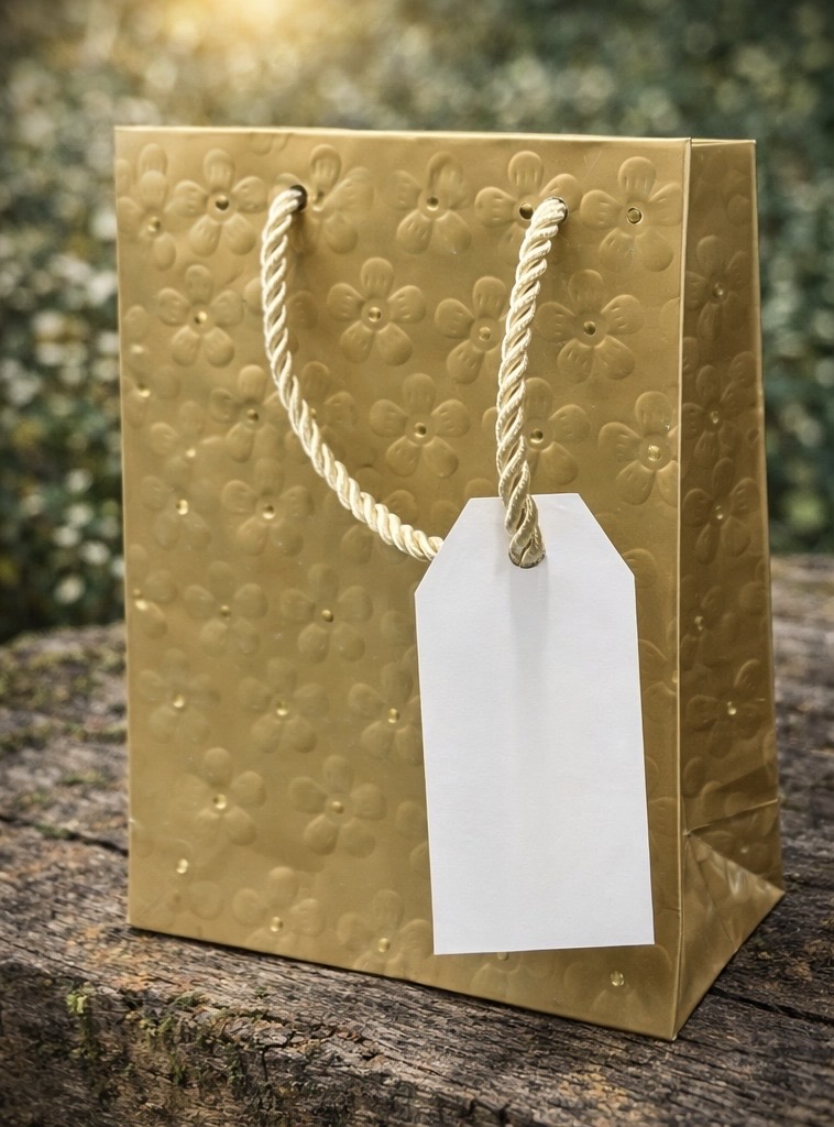 Плотный картон хорошо держит форму, а прочные витые ручки обеспечивают удобство переноски. Универсальный дизайн подходит для любого повода — дня рождения, свадьбы, юбилея, корпоративного подарка или праздника.