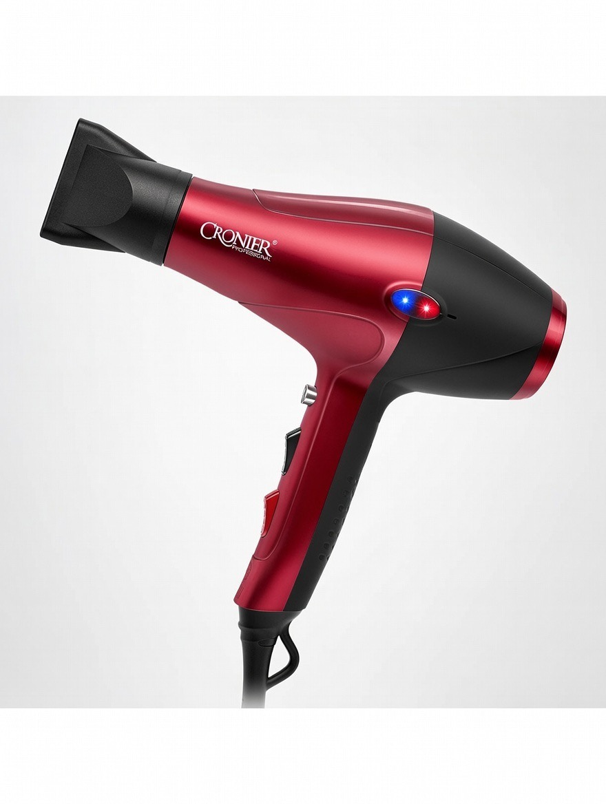 Яркий рубиново-красный корпус с чёрными акцентами выглядит стильно и дорого. Эргономичная форма, удобная ручка и индикатор ионизации (сине-красные огоньки) сразу создают ощущение премиум-класса.