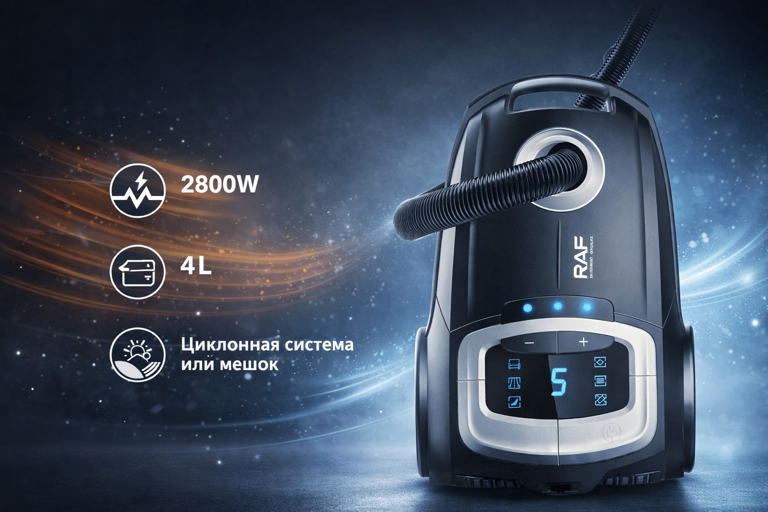 Мощный и надёжный пылесос RAF создан для эффективной и быстрой уборки дома. Благодаря высокой мощности 2800 Вт он легко справляется с пылью, грязью и шерстью животных.