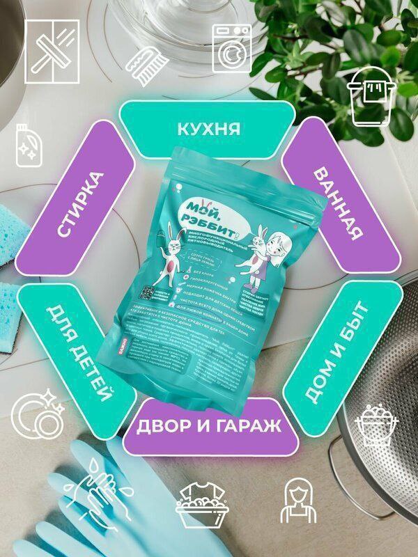 Эффективно удаляет пятна с одежды, посуды, кухонных принадлежностей, полотенец, сковородок, кастрюль, ванной комнаты, душа, туалета, мебели, ковров, обуви и еще более 30 способов применения.🕊️ Помимо очищения, "Мой, Рэббит!" дезинфицирует и удаляет неприятные запахи. Средство абсолютно безопасно для всех - в его составе нет хлора. Гипоаллергенный ЭКО-порошок, можно применять для детских вещей.📝ИНСТРУКЦИЯ ПО ПРИМЕНЕНИЮ🤍Выведение пятен с белых и цветных материалов. Отбеливание.В горячую воду (70-90°C) добавьте порошок из расчета 1-2 мерные ложки (в зависимости от степени загрязнения) на каждый литр воды и любое синтетическое моющее средство. Замочите вещи в растворе на 15-60 минут. При застарелом загрязнении (или желтизне) увеличьте время максимум до 6 часов. Затем выстирайте в обычном режиме. Не замачивайте вместе цветные и белые вещи. Не сыпьте гранулы сверху на ткань.🤍Чистка кухонной утвари.В максимально горячую воду (90°C) добавьте порошок из расчета 1-2 мерные ложки (в зависимости от степени загрязнения) на каждый литр воды и 1 мерную ложку любого средства для мытья посуды. Замочите предметы в растворе на 15-60 минут. Тщательно промойте водой.🤍Удаление загрязнений с поверхностей, обивки мягкой мебели и ковров.Смешайте средство с небольшим количеством горячей воды (90°C) до образования пасты моющего средства. Добавьте каплю синтетического моющего средства. Не нужно ждать растворения гранул! Нанесите получившуюся пасту на загрязнение и оставьте на 30-60 минут. Периодически смачивайте пасту горячей водой (например, из пульверизатора). Удалите остатки гранул влажной тканью или с помощью пылесоса.🤍Ручная и автоматическая стирка 30-90°C (усилитель действия порошка).Добавьте от 1 до 2 мерных ложек пятновыводителя, в зависимости от степени загрязнения, к вашему основному порошку. Подходит для белых и цветных тканей. 1 мерная ложка = 1 столовая ложка.🤍Средство для посудомоечной машиныДобавьте 1 мерную ложку очистителя "Мой, Рэббит!" в соответствующий отсек посудомоечной машины, установите режим интенсивного мытья при температуре выше 70 °C. И все! Вам останется лишь достать чистую посуду.🤍Устранение налета растворите 40 г (1,5-2 мерные ложки) на каждый литр горячей воды. Можно протирать и мыть поверхности с налетом такие как (кафель, сантехника в ванной и на кухне и другие поверхности), которые не боятся воды (удаление загрязнений, налета + обеззараживание).🤍Чистка вытяжкиЗалейте вытяжку кипятком и добавьте 1-3 мерные ложки очистителя из расчета 1 ложка на 1 литр воды. Оставьте на 30 минут. После ополосните под проточной водой.🤍Устранение грибкаРастворите 50-60 г (2-3 мерные ложки) на каждый литр горячей воды. Хорошо намочите обрабатываемую поверхность и оставьте на 1 час. Почистите поверхность щеткой и тщательно смойте остатки плесени.🤍Устранение запахов домашних животныхРастворите 40 г (1,5-2 мерные ложки) порошка на каждый литр горячей воды. Можно протирать и мыть источник запаха желательно еще оставить раствор на 10 минут, а после смыть его водой.🤍Чистка детских игрушекРастворите порошок в горячей воде (на одну стирку или на 10 литров): 30 г (1,5-2 мерные ложки) для легких загрязнений, 50 г (2-2,5 мерные ложки) для умеренных загрязнений, 100 г (5-6 мерных ложек) для сильно загрязненных тканей. Время замачивания - 1 час.