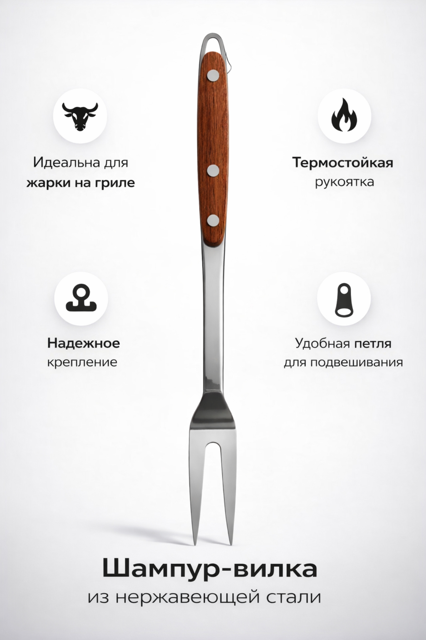 Используйте вилку для переворачивания и удерживания мяса, овощей или других продуктов во время приготовления на гриле или мангале. После использования очистите инструмент и храните в сухом месте.