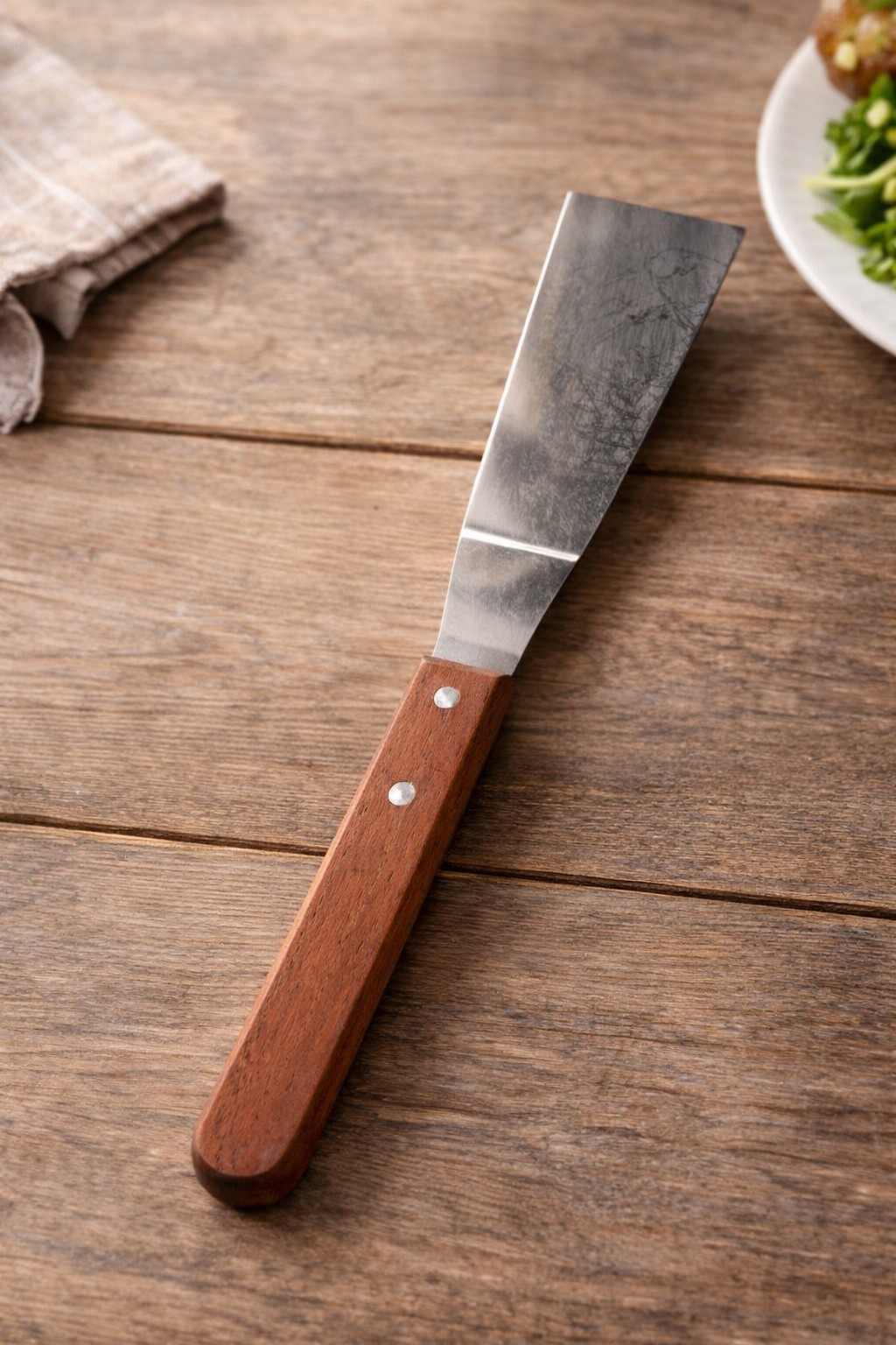 Деревянная ручка обеспечивает надёжный и комфортный хват, не нагревается во время использования и снижает скольжение. Простая и надёжная конструкция делает шпатель удобным инструментом для дома, кафе и уличной кухни.