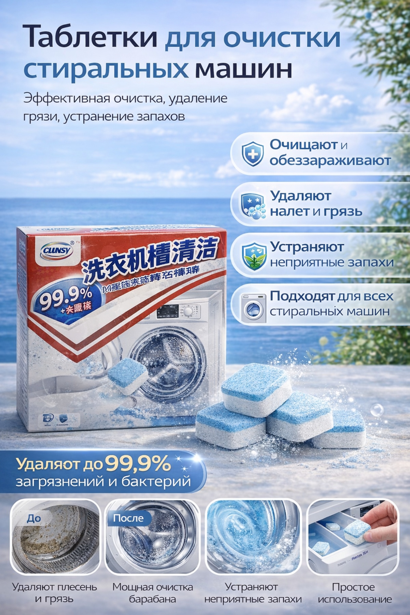 - ✅ Очищает барабан, фильтр и внутренние элементы