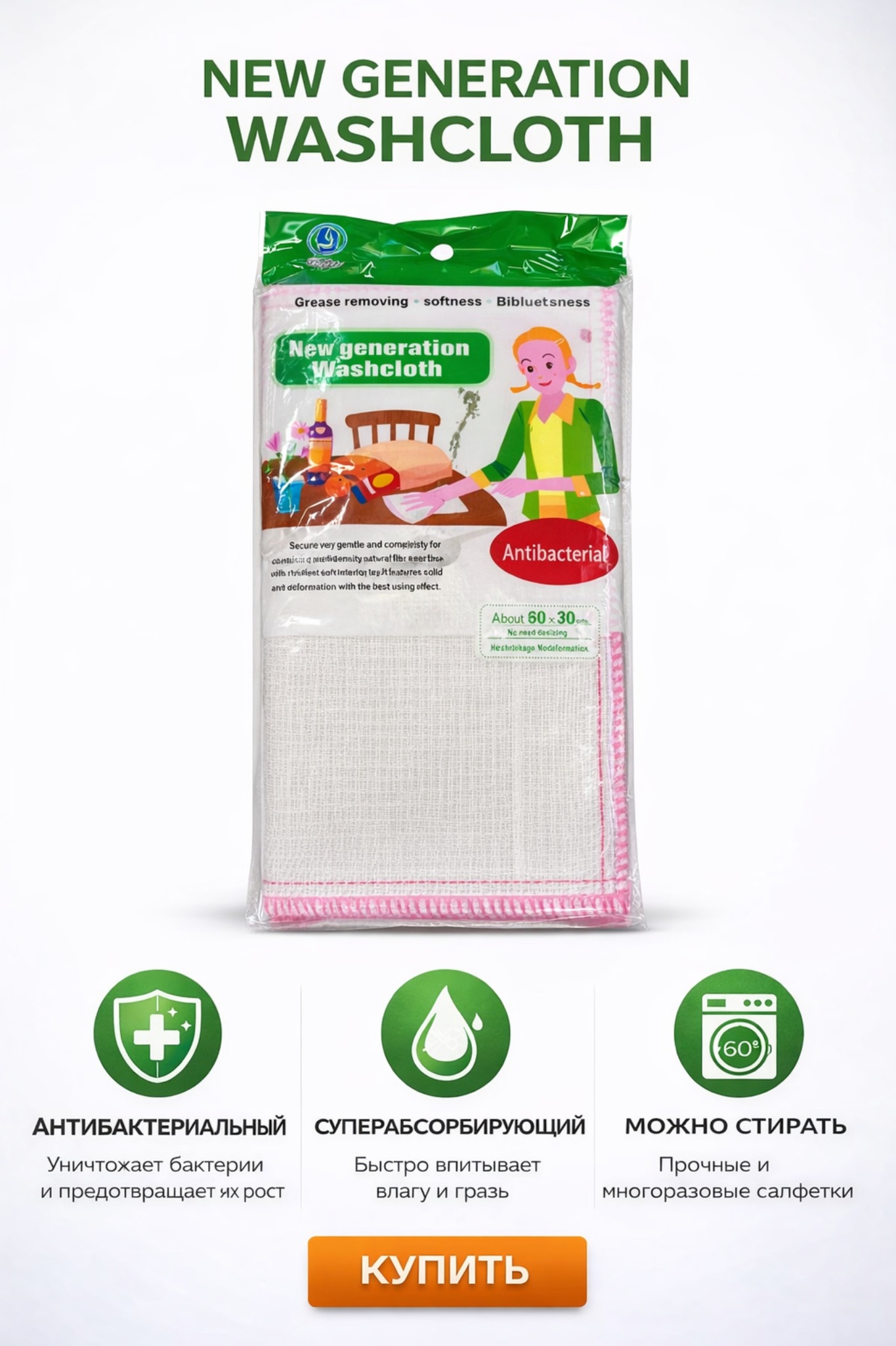 Салфетка быстро впитывает воду, жир и загрязнения, оставляя поверхности чистыми и сухими.